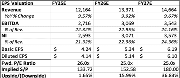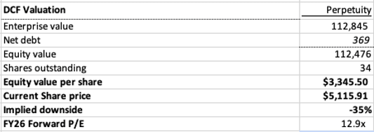 DCF valuation suggests 7% upside. EPS/P/E analysis shows 30% upside assuming flat multiples, expanding to 60% upside if ABNB reverts to historical average multiples. Combined with the BKNG short leg, the pair trade offers 37% potential return in the moderate scenario by FY27, reaching 90% in the optimistic case with multiple re-rating.
