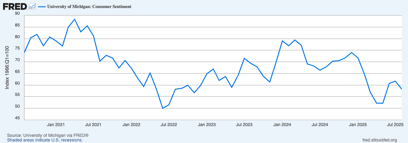 What’s especially striking is the split between how people feel about the economy and what they’re doing with their money. UoM Consumer sentiment data is weak, reaching levels which we saw in the 2022 economic downturn (as seen in the graphs). It shows that people are worried about jobs, inflation, and the cost of living. Yet retail investors are still putting money into the market, though not out of confidence in the future or the fundamentals of the company, if they even know about them. It’s more of an anxious participation, driven by FOMO or falling behind. This can unravel quickly if economic worries start to materialise. Many of these same investors might need to sell quickly, not because of a change in company fundamentals, but simply to cover living expenses. In other words, the market’s strength might be more fragile than it appears, propped up by participants who are ready to run at the first real sign of trouble.