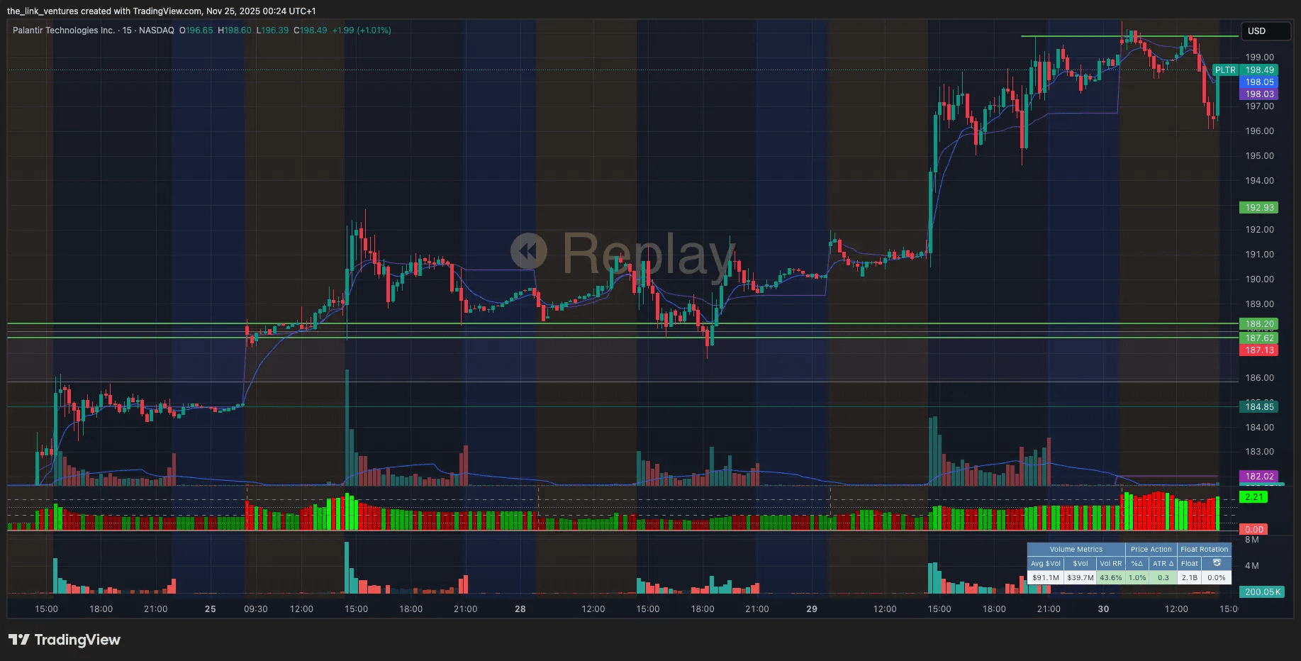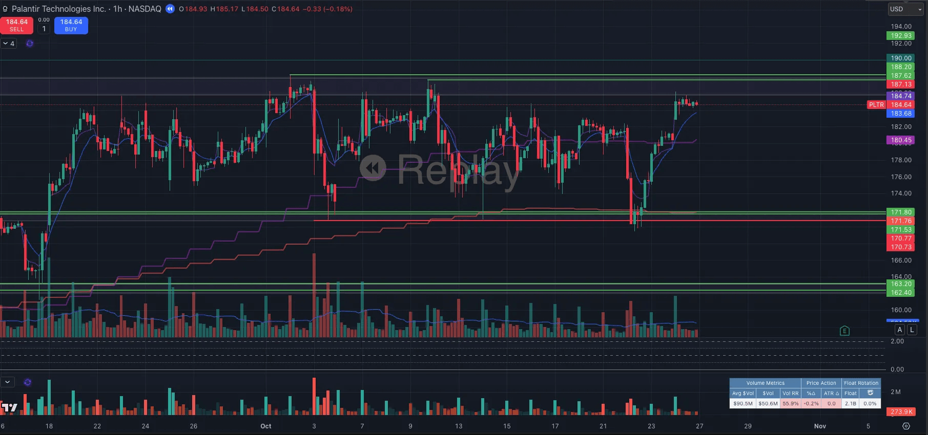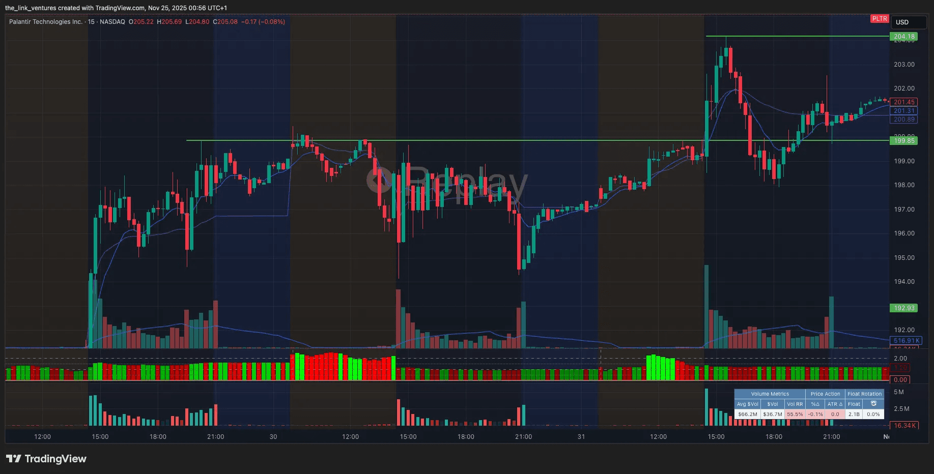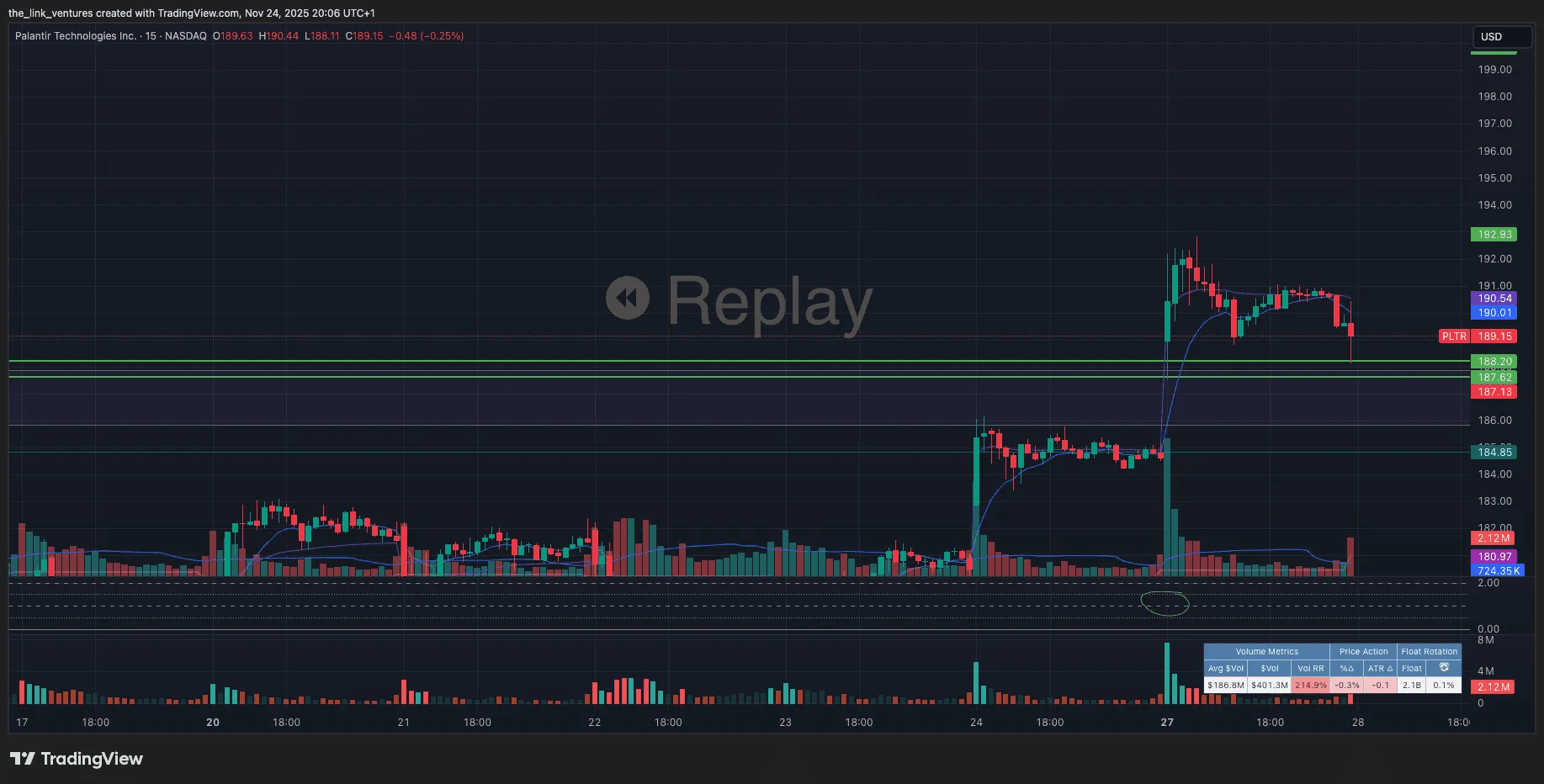 The market clearly remains long here which should allow for favourable beta on the PLTR trade. On the following Monday morning, we actually gap up again on the back of political news over the weekend. This set up a potential market overextension which could have an impact on the PLTR trade if the market is not able to hold higher. Thus, monitoring the broader market and main contributors to the indices was crucial.