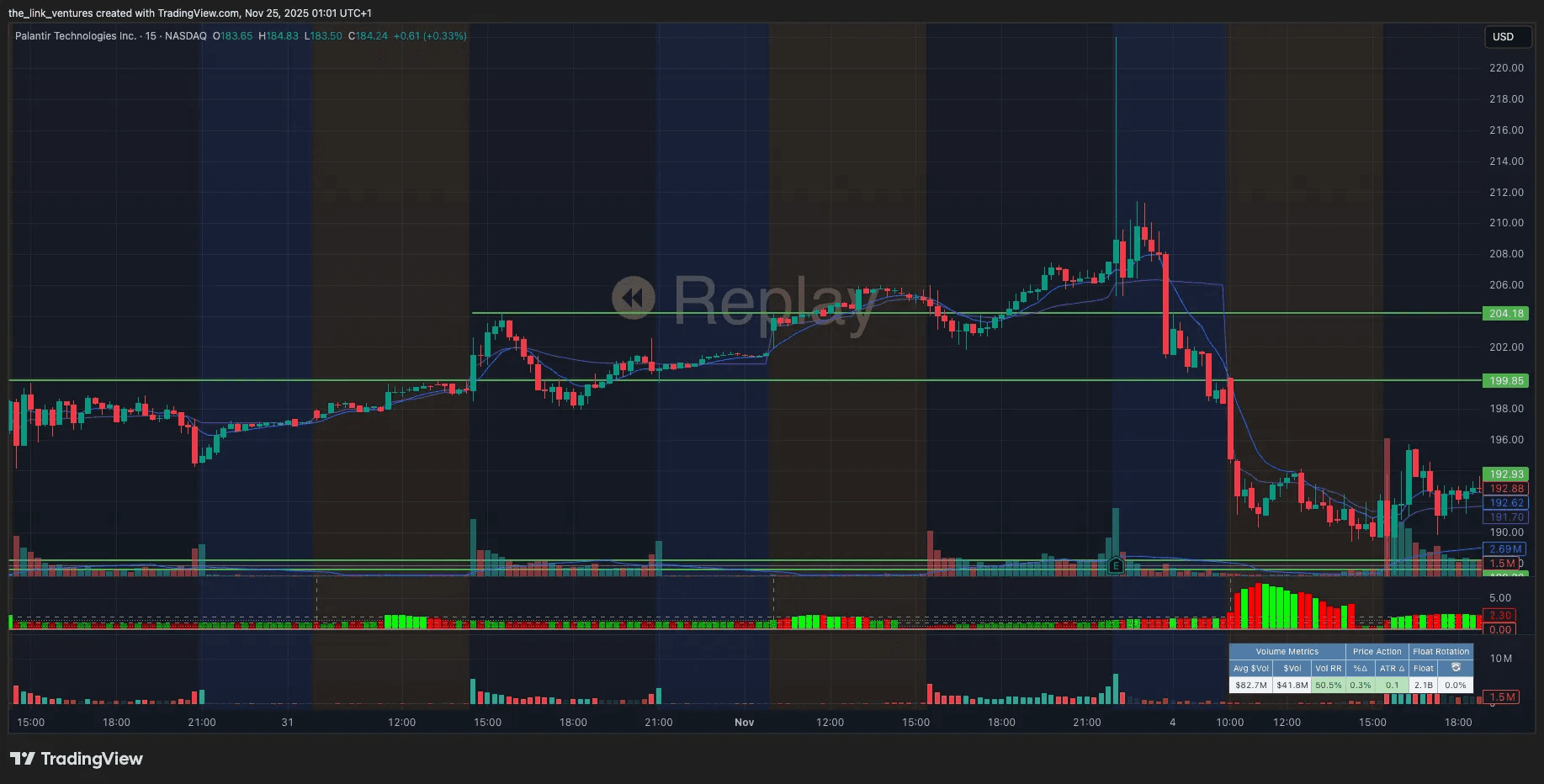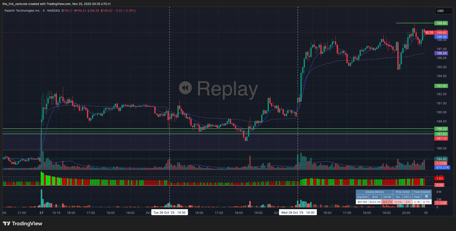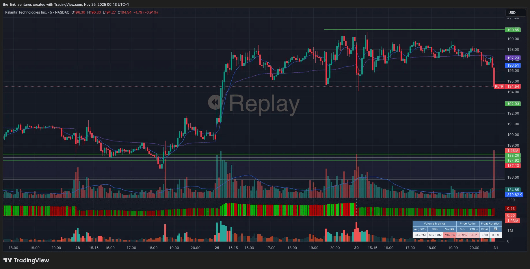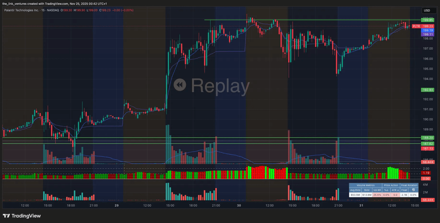 The market clearly remains long here which should allow for favourable beta on the PLTR trade. On the following Monday morning, we actually gap up again on the back of political news over the weekend. This set up a potential market overextension which could have an impact on the PLTR trade if the market is not able to hold higher. Thus, monitoring the broader market and main contributors to the indices was crucial.