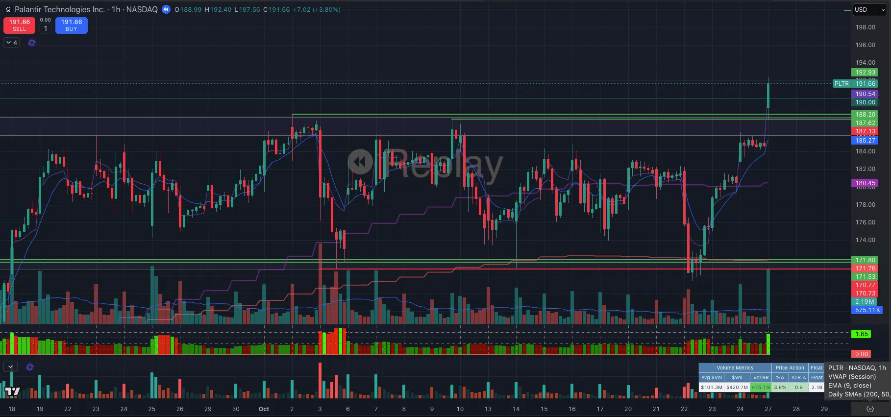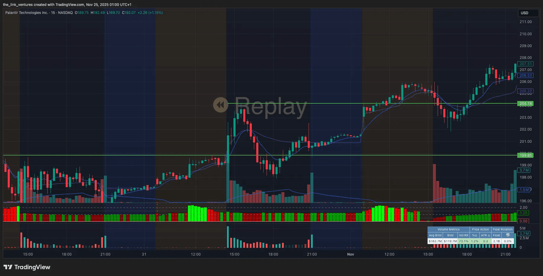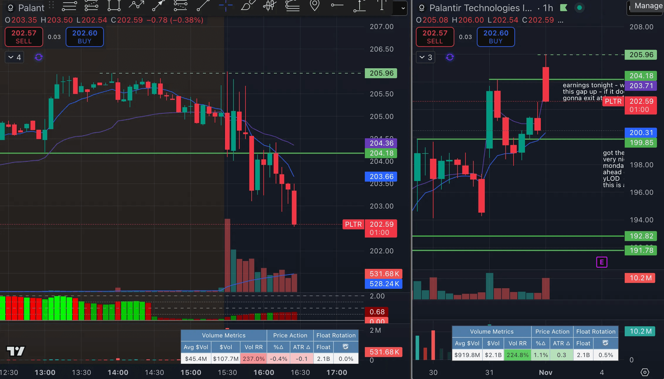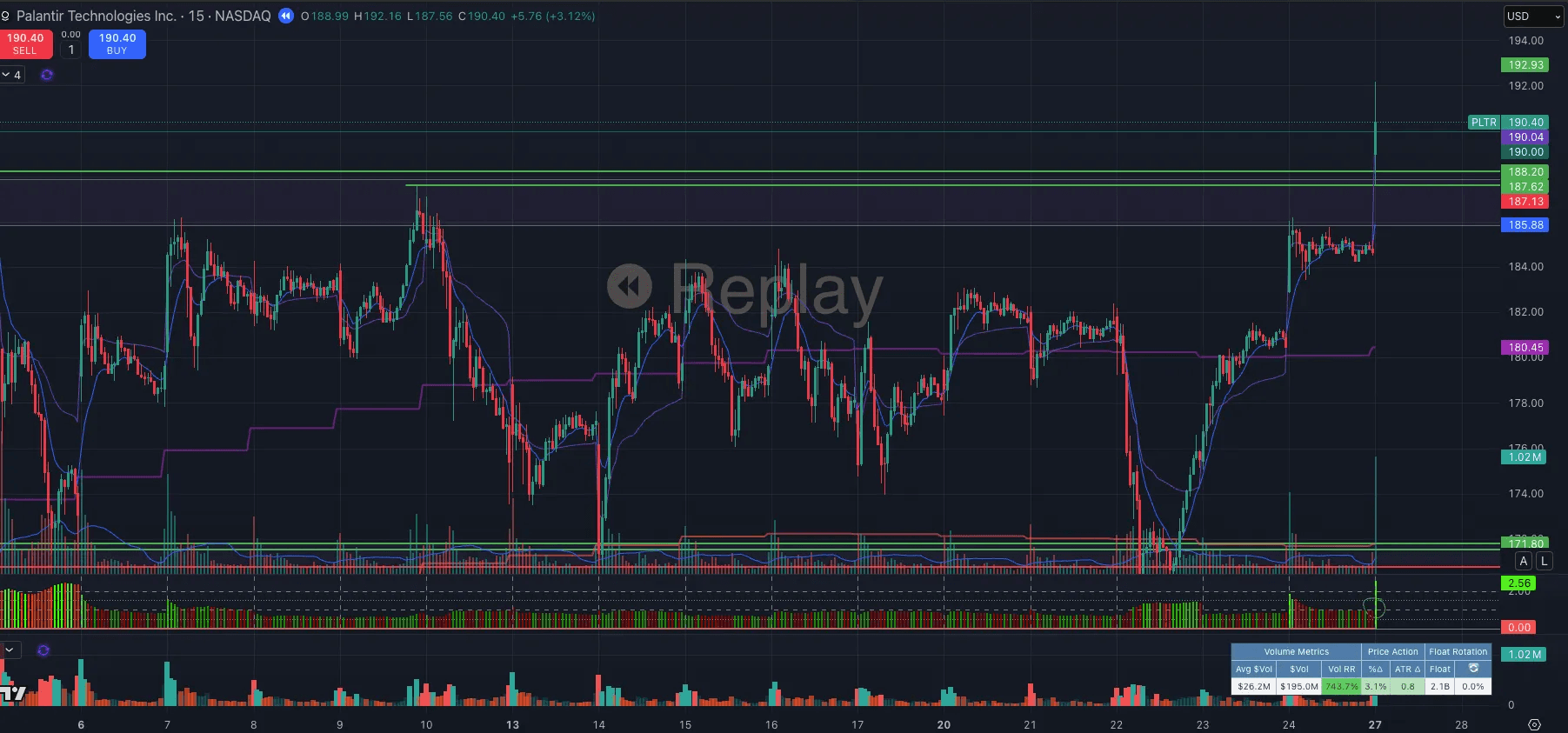 The market clearly remains long here which should allow for favourable beta on the PLTR trade. On the following Monday morning, we actually gap up again on the back of political news over the weekend. This set up a potential market overextension which could have an impact on the PLTR trade if the market is not able to hold higher. Thus, monitoring the broader market and main contributors to the indices was crucial.