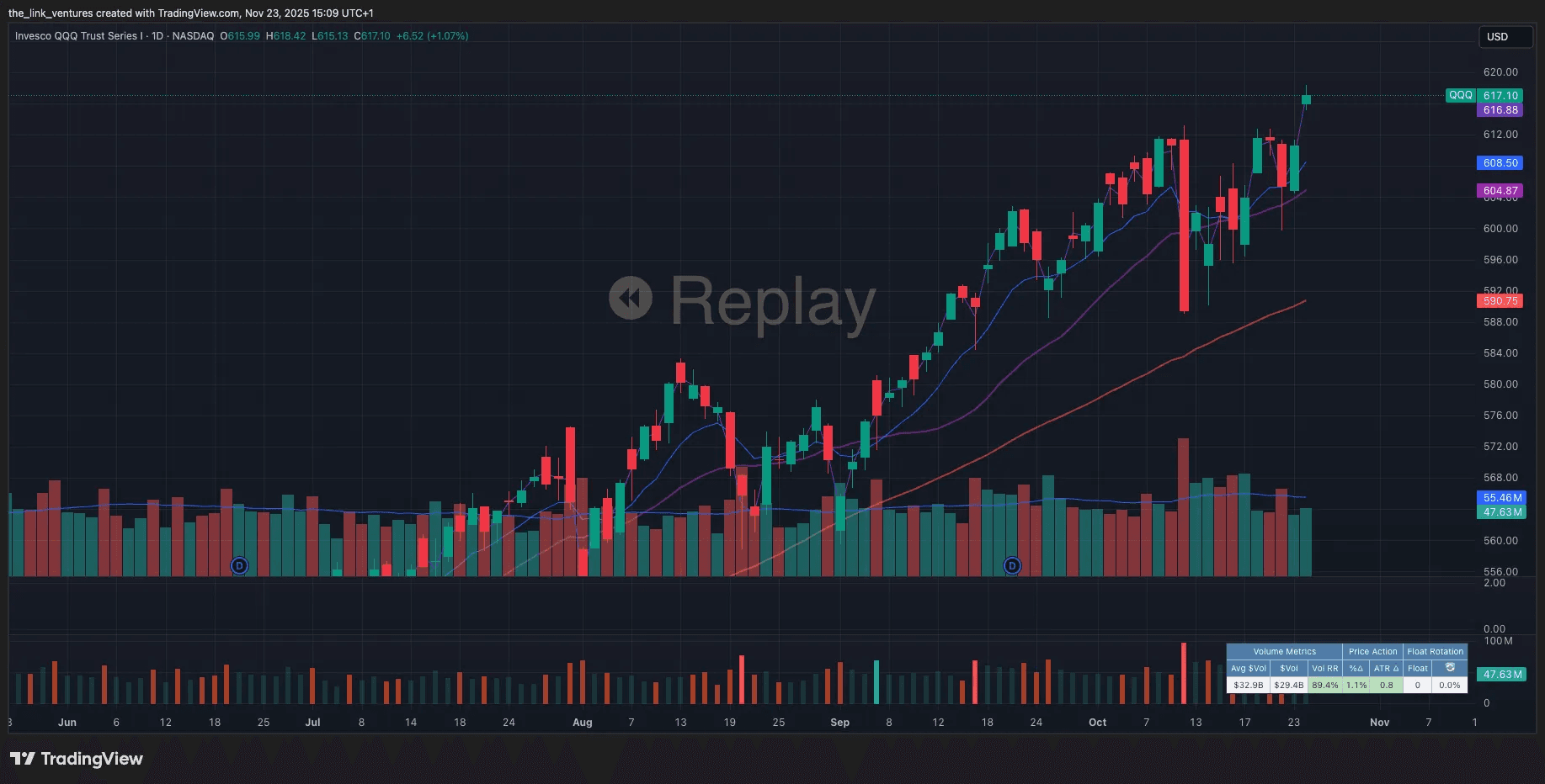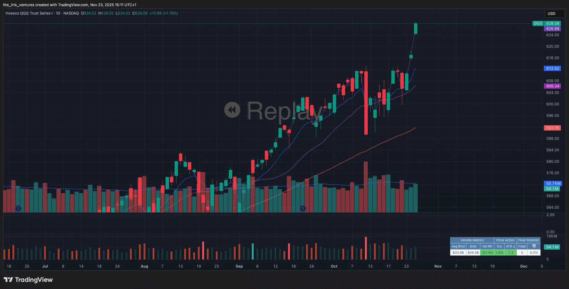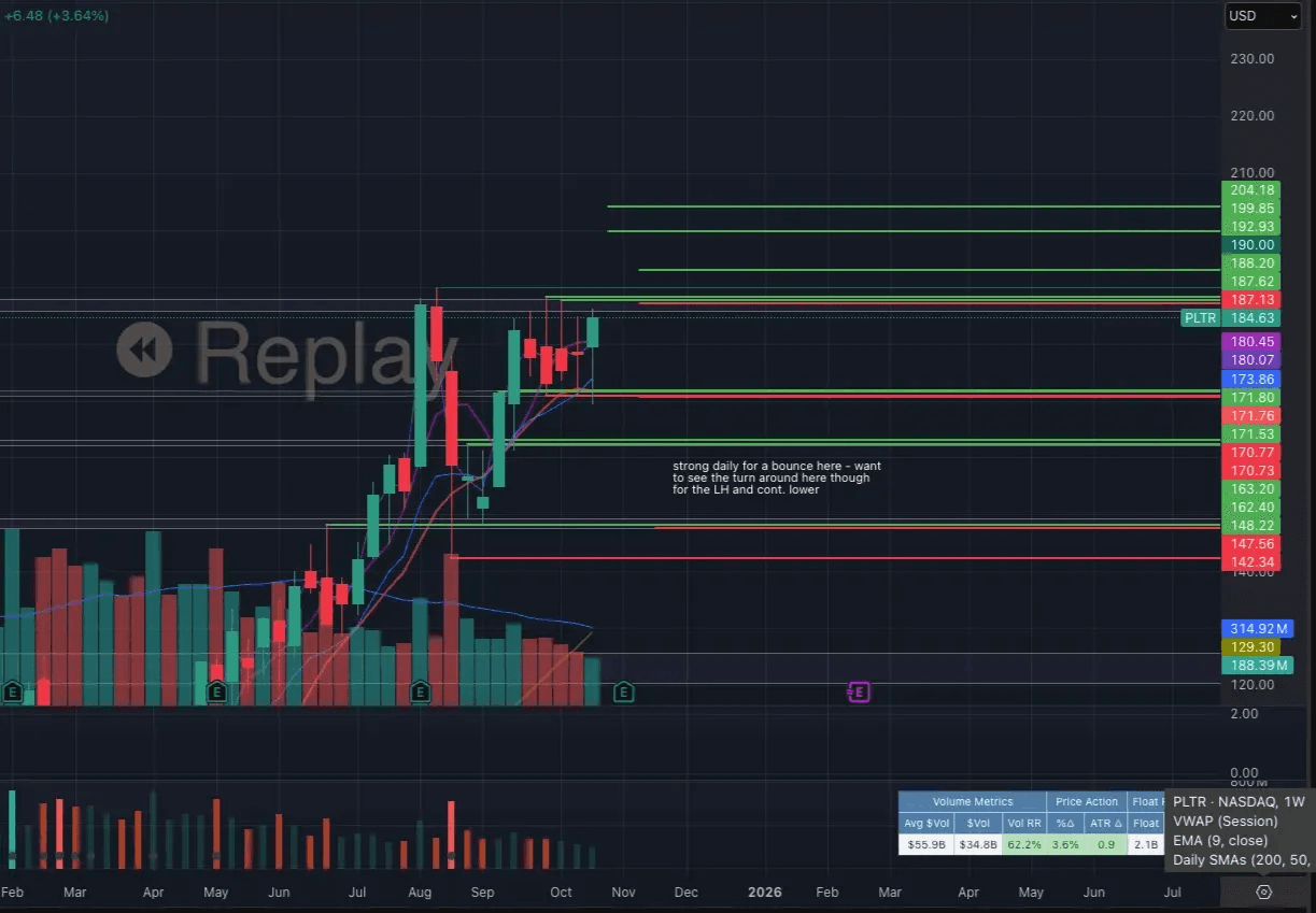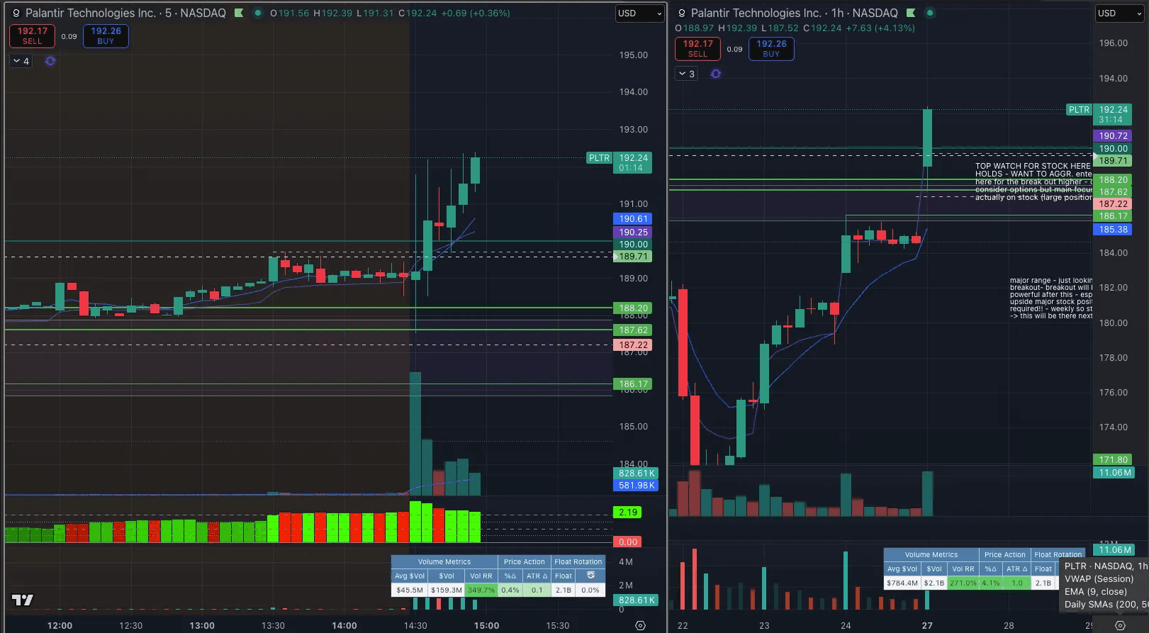 The market clearly remains long here which should allow for favourable beta on the PLTR trade. On the following Monday morning, we actually gap up again on the back of political news over the weekend. This set up a potential market overextension which could have an impact on the PLTR trade if the market is not able to hold higher. Thus, monitoring the broader market and main contributors to the indices was crucial.