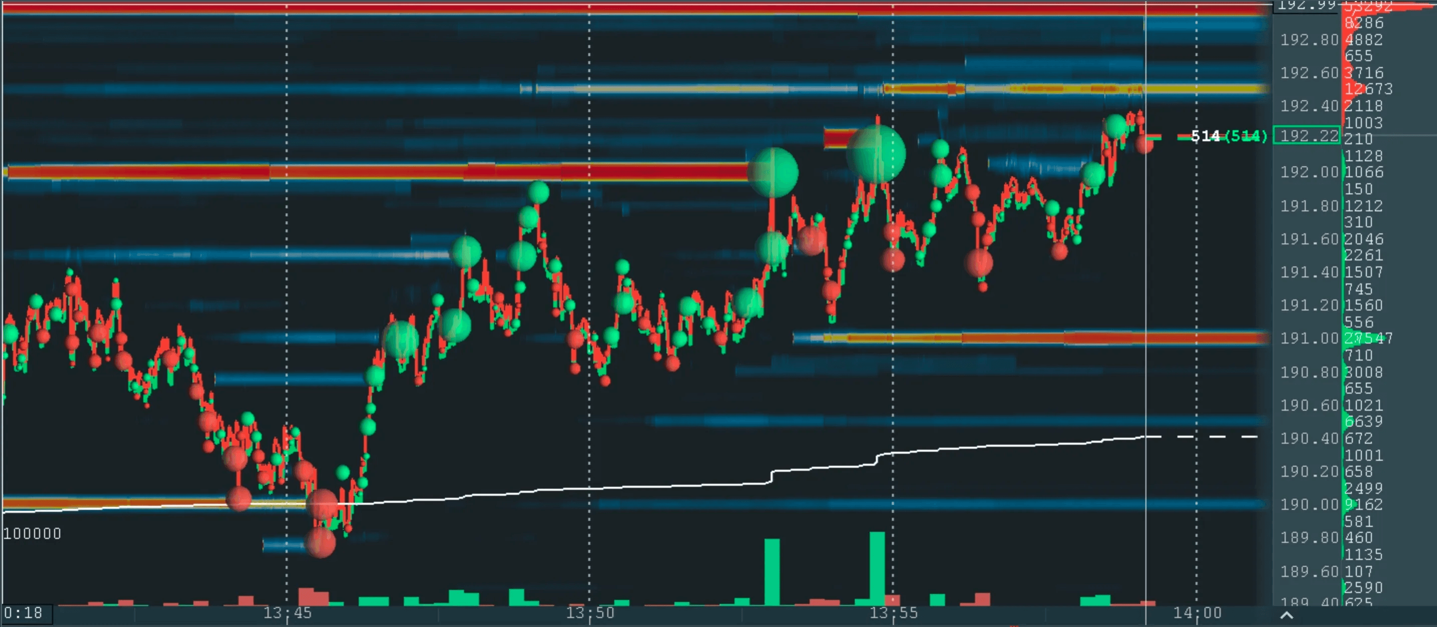 On the heatmap, we can see asks trying to get filled, but there is a clear interest higher as the pullbacks post-ask fills are weak and we get supporting bids coming in. This is a typical picture of aggressive buyers trying to push the stock higher with no sustainable selling rejecting it. Not entering the position here because of these asks getting filled would be a fatal mistake, as they are clearly not as strong, nor are they reloading a lot.