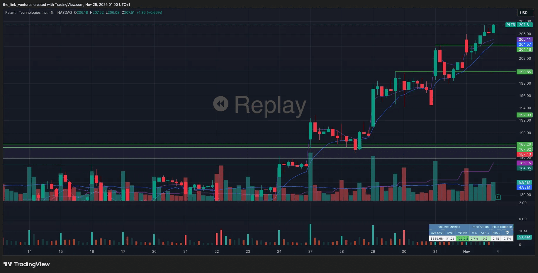 I entered the trade on 27/10/25 trading only PLTR shares. I exited full position one week later on 03/11/25, having taken partials before on 30/10/25 and 31/10/25.