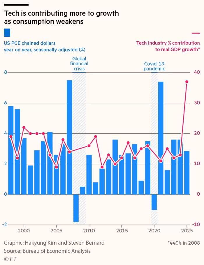 According to recent analysis from the Financial Times, tech's contribution to real GDP growth has spiked to over one-third this year—a dramatic increase from the historical baseline of 10-20%. At first glance, this looks like a massive red flag. Tech dominance at these levels seems unsustainable, almost bubble-like.